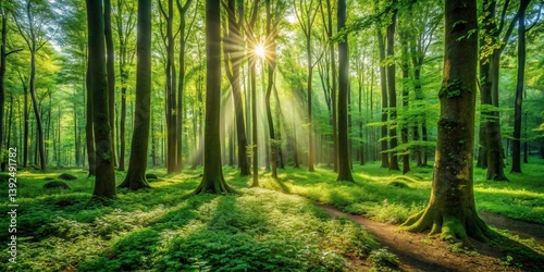 © Watcharapon, Obraz premium Soft warm light filters through dense foliage