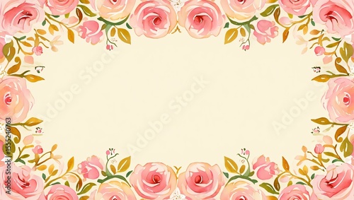Obraz premium Soft watercolor floral border with pink roses and green leaves on a cream background