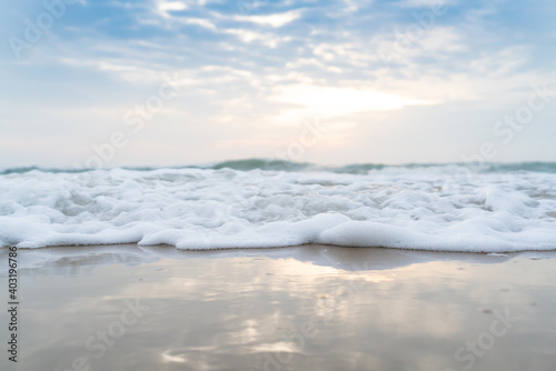 Obraz premium Soft wave of the tropical sea on the sandy beach.