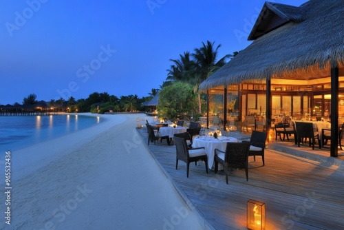 © AiHRG Design, Fototapeta premium Soft waves roll gently onto the sandy shore, where an exquisite dining setup awaits. Lanterns light the path as couples savor a romantic dinner surrounded by lush palm trees and tranquil waters.