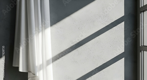 Obraz premium Soft White Curtain Draped Against Gray Wall with Diagonal Sunlight Creating Artistic Shadows in Minimalist Interior Space