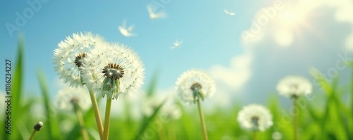 © methinee, Obraz premium soft white dandelion puffs float gently in the breeze, sky, garden, dandelion