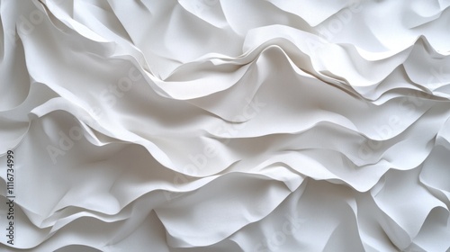 Fototapeta premium Soft white fabric undulates in a mesmerizing pattern, creating beautiful waves and folds. The texture captures light and shadow, infusing the environment with a tranquil, sophisticated aura