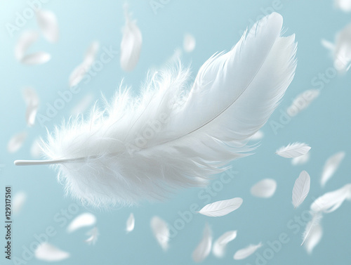 © Bohdan, Obraz premium Soft white feather drifting through light blue background
