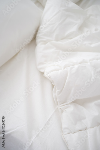 Obraz premium Soft white pillows on messy bed, closeup.