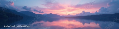 © anulak, Fototapeta premium Soft wispy clouds float above a serene lake surface at dusk, twilight, peaceful
