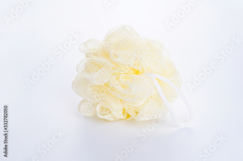 Fototapeta premium Soft yellow bath puff or sponge on a white background.