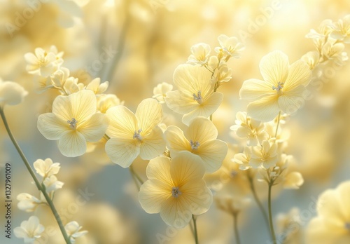 © ANUAR, Fototapeta premium Soft Yellow Flowers in Delicate Bloom with Beautiful Light Background Capturing the Serenity and Elegance of Nature’s Floral Beauty