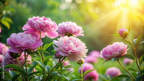 © Nasnunt, Obraz premium Softly bloomed delicate pink peony flowers in a lush garden setting with greenery and sunlight filtering through trees