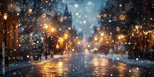 © Nikita, Naklejka premium Softly blurred lights in a snowy cityscape creating a serene winter scene with glowing festive tones, style book illustration
