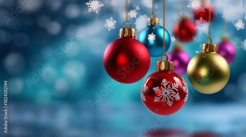 Fototapeta premium Softly defocused red holiday background with blurred hanging blue, gold, and green ornaments, gentle white snowflakes floating across the frame, dreamy festive atmosphere, with cop