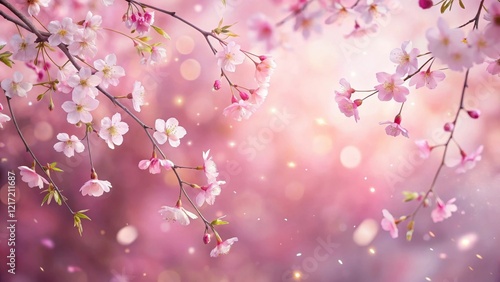 Fototapeta premium Softly falling cherry blossoms blanket a delicate tender pink background with...