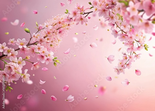 Fototapeta premium Softly falling cherry petals in a vibrant springtime swirl dance across a pastel pink background