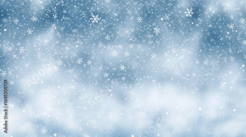 © video, Fototapeta premium Softly falling snowflakes creating a serene winter scene with a blurred snowy background and a calming blue sky