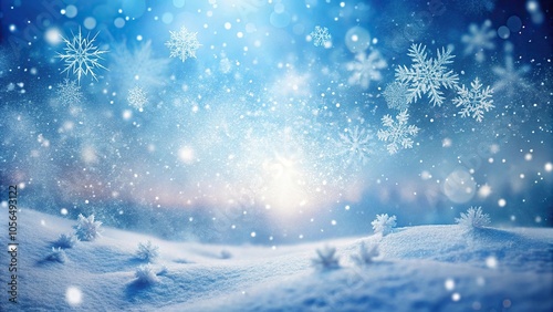 © Sathaporn Buarabut, Naklejka premium Softly falling snowflakes gently cover the frosty landscape with delicate white and pale blue hues, soft flakes, snowfall