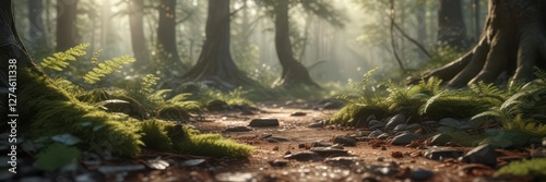 Fototapeta premium Softly filtered light casting intricate patterns on forest floor, forest,...