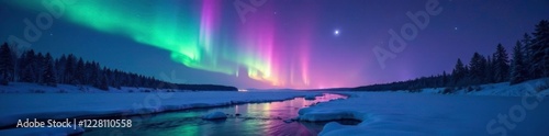 Naklejka premium Softly glowing aurora borealis above icy river water, night, colorful