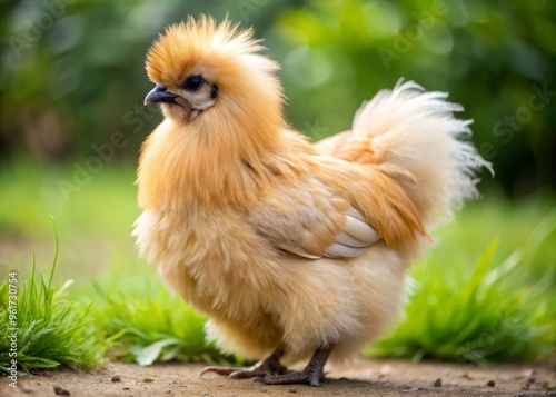 © DigitalArt Max, Fototapeta premium Softly glowing buff feathers envelop this delightful silkie chicken, with delicate feet sporting fluffy feathers and a