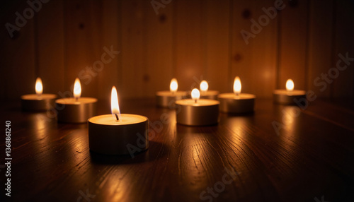 Fototapeta premium Softly Glowing Candles Illuminating a Wooden Background