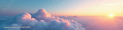 © Kingphet, Fototapeta premium Softly glowing clouds drift across the pale blue sky at sunrise, natural light, morning, soft focus