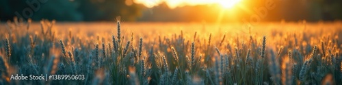 © Sutasinee, Obraz premium Softly glowing golden light falls on blue grain fields, sunny landscape
