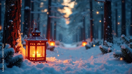 Naklejka premium Softly glowing lanterns amidst a forest of pine branches and snowy pine...