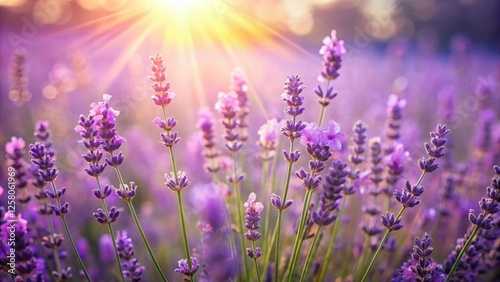 Naklejka premium Softly glowing lavender fields on a sunny day with delicate purple flowers...