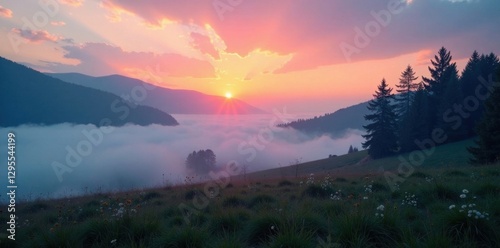 Fototapeta premium Softly glowing mist envelops a serene landscape at dusk, atmosphere, misty,