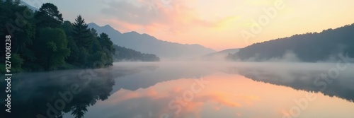Obraz premium Softly glowing mist rises from a serene lake at dawn, natural, peaceful