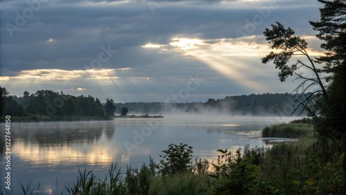 Fototapeta premium Softly glowing mist rises from a serene lake on a calm morning, dawn,...