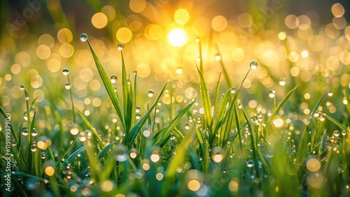 © Nasnunt, Obraz premium Softly glowing morning light illuminates the delicate droplets of dew on freshly cut spring grass, creating a serene and peaceful atmosphere , morning dew, fresh cut grass