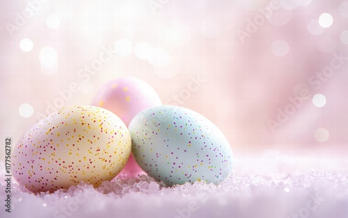© Marina, Obraz premium Softly glowing pastel Easter eggs on a light baby pink background