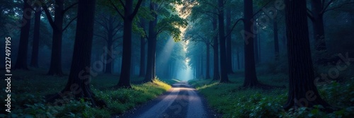 © AiGallery, Obraz premium Softly illuminated forest path under starry sky, peaceful ambiance, nocturnal scene, dark foliage