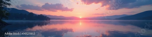 © Kachaphot, Fototapeta premium Softly lit lake surface reflecting serene dawn sky, serene atmosphere, morning mist, dawn lake
