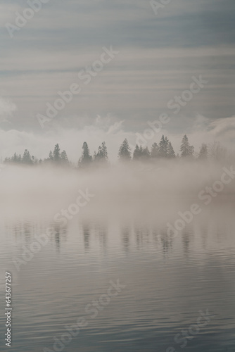© Josh, Fototapeta premium Softly reflecting trees dance in the water during sunrise