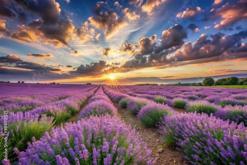 © Autun, Fototapeta premium Softly swaying lavender petals dance in the warm summer air, surrounded by a tapestry of purple hues, under a cloudless blue expanse.
