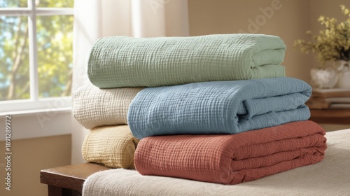 © Lee, Fototapeta premium Softly Woven Cotton Throws in Earthy Tones Stacked Neatly for Cozy Home Decor