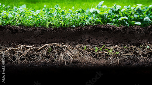© kaliel, Fototapeta premium Soil fertility testing with plant roots and soil layers exposed, soil fertility, agricultural science