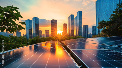 © Jack, Fototapeta premium Solar energy in an urban environment at sunset with modern buildings