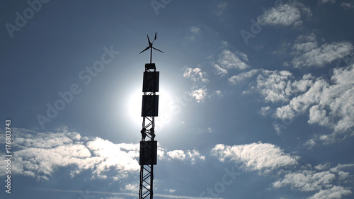 © andreysha74, Fototapeta premium Solar panel and wind turbine on the sky background .