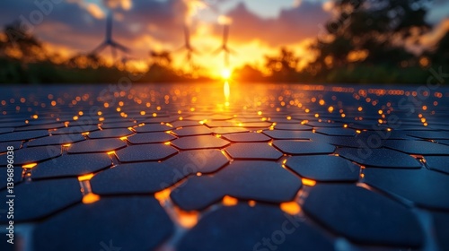 © muhammad, Obraz premium Solar panel array at sunset, wind turbines visible in the background
