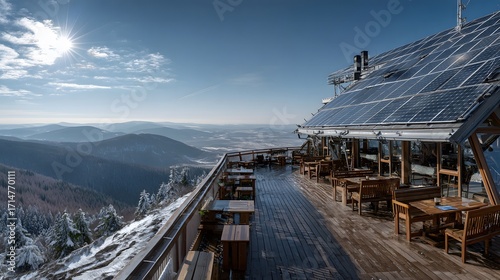 © olhen_design, Obraz premium Solar Panel Building on Mountain Peak Overlooking Valley with Winter Forest and Blue Sky