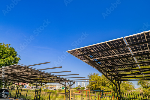 Obraz premium Solar panel carport providing shade for parked vehicles on a sunny day....