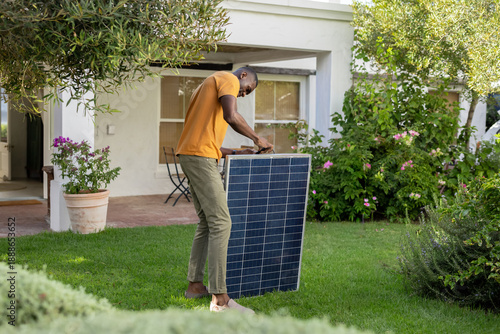 © wavebreak3, Fototapeta premium Solar panel is standing upright on lawn by porch, with potted plant and patio table