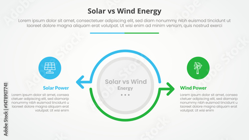 © fatmawati, Naklejka premium solar panel vs wind energy power comparison opposite infographic concept for slide presentation with big circle and arrow outline opposite direction with flat style