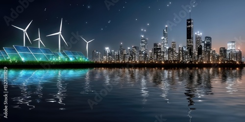 Fototapeta premium Solar Panels and Wind Turbines With City Skyline at Night, Showcasing...
