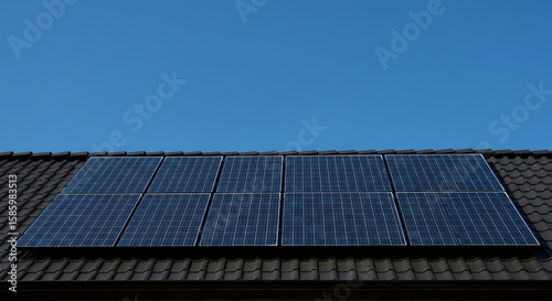 © gs2, Naklejka premium Solar panels installed on a dark tiled roof against a clear blue sky, capturing sunlight.