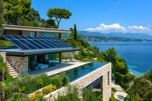 Obraz premium Solar Panels Installed On A Luxury Villa In The French Riviera, Solar Photography, Solar Powered Clean Energy, Sustainable Resources, Electricity Source, French Riviera Coast Solar Installation