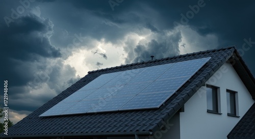 © Studio Stock Noerul, Fototapeta premium Solar panels on a dark stormy day