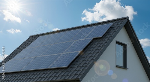 © homan, Naklejka premium Solar panels on a house roof under a sunny sky with clouds.